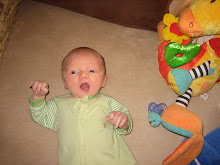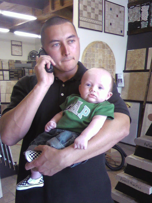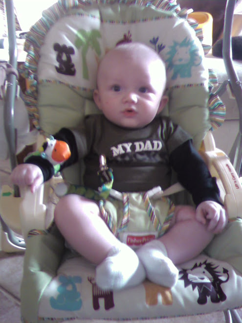 In THREE days Kade we'll be "Eight weeks old!!!" We can not believe it. The First Month and a half were definitely an adjustment for Kyle and I. We did not expect a c- section for sure,and really did not expect it to open. You take what you get and try to stay positive... and that's what we did. With many prayers from family & friends, and more than a hand full of Dr. visits(courtesy of mullen) I made it out alive and still in one piece. Kyle and I ...and Baby Kade are one lucky bunch... WE HAVE HAD SO MUCH HELP. I would have probably had a nervous break down without my family. The Moms (Kades Grandma's) really came through.... Grandma Teri practically lived here. She had no choice we made her! While she was here she changed many "poopy"diapers, was a professional at bottle making, and drove me to the doctors more often than not. We had so many good laughs ... . Even though Grandpa Ron & Grandma Deb live four hours away they made sure they were here for the excitement too! Grandpa Ron makes every excuse to come down and see the little guy. He luvs him! He's the happiest man alive right now. Everyone who knows Grandma Deb knows that she go's go's go's. We always had clean clothes and Kyle still looked as beautiful as ever with he's perfectly ironed shirts. While making sure baby kade was full, clean, and content she managed to even clean my baseboards! What a woman! One Saturday when Mullen (Teri) couldn't make it Grandpa Mark came to the rescue!! I needed a break and he was here to help. He got Kade all set up. He put him in his boppy pillow, put some stuffed animals around him and Kade was a happy boy. A few minutes later they were both asleep!!! LOL. Grandma Cheryl ( Kade has a ton of grandma's) was here too. She did what she could, she made sure the dishes were clean and coffee was always made! P.S mom, we look forward to you being back to yourself soon and healthier than ever.... and when you are you have allot of "IOU babysitting!!!". Papa Kyle has been wonderful too. He woke up every night in the last month or two to hand me baby Kade!! Believe me it was not ALWAYS fun living with me! ( hard to believe huh!). Babe, you have been so awesome. You are the rock of this Family.... you are such a great husband and a great new dad! We have had our share of laughs too. You would not believe how the littlest stuff has been so funny to us... But that's what happens when your on three hours of sleep!! LOL. Kyle and I have had so much fun giving baths, dressing him, and watching kade grow.. Literally he was almost eight lbs Jan 8th and now he's almost a big "one two". That's right ! Almost 12 lbs! We starve the poor child! He has started to talk ( not sentences but were almost there..) and smile. It is so stinking cute I cant stand it. Kade is the perfect child... every "NEW" parent probably thinks that but he really is! For those woman out there that have had kids be jealous this seven week old boy..my boy, eats at eight o'clock pm and we don't see his smiling face until five-six o'clock in the morning! crazy huh! I know I told yeah. Thursday I plan to take Kade to get his eight week pictures so look forward to seeing those soon!!!! ...And no I have not mailed out announcement ....I've been busy!!.... But I will soon. Hopefully its not with his one year birthday invitation!!
